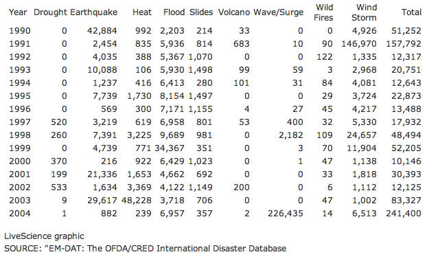 According to the EM-DAT, the international disaster database, the total natural disasters reported each year has been steadily increasing in recent decades, from 78 in 1970 to 348 in 2004.
