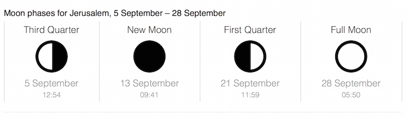 According to astronomical data, the New Moon of September, which is the real determining factor for when The Feast of Trumpets occurs, begins at 9:41 am in Jerusalem, on September 13, 2015. The officially recognized beginning in Israel, will not occur until 6 pm.