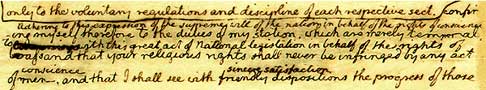 In the deleted section of Jefferson’s letters he explains why he did not proclaim a national days of fasting and thanksgiving, as had his predecessors, Presidents Adams and Washington.. Examining the left margin of the deleted section, Jefferson writes that he removed the section to avoid offending “our republican friends in the eastern states” who cherished days of fasting and thanksgiving.