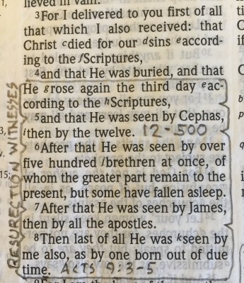I passed on to you what was most important and what had also been passed on to me. Christ died for our sins, just as the Scriptures said. He was buried, and he was raised from the dead on the third day, just as the Scriptures said. He was seen by Peter and then by the Twelve. After that, he was seen by more than 500 of his followers at one time, most of whom are still alive, though some have died. Then he was seen by James and later by all the apostles. Last of all, as though I had been born at the wrong time, I also saw him. For I am the least of all the apostles. In fact, I’m not even worthy to be called an apostle after the way I persecuted God’s church. ~1 Corinthians 15:1-9 (NLT)
