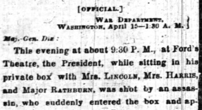 “This evening at about 9:30 P.M., at Ford’s Theatre, the President, while sitting in his private box with Mrs. Lincoln, Mrs. Harris and Major Rathburn, was shot by an assassin…”