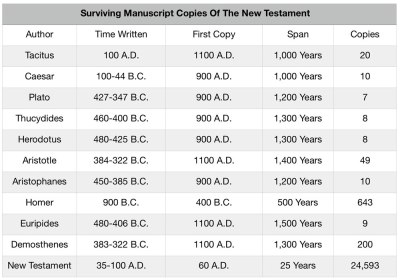 - The New Testament exists today as the largest single record of the true events of Jesus life, death, and resurrection—superior to any other god or religion of the world. There are 24,593 surviving manuscripts which describe Jesus life, death, and resurrection. Every other religious texts that have survived time and decay, were written many hundreds or even thousands of years after the events took place, and have only hundreds of surviving copies, compared to nearly 25,000 New Testament Manuscript.