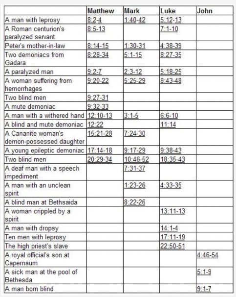 In the following charts which exhibit the miracles Jesus performed, we see that each of the three synoptic Gospels describe the same miracles. At the same time, they also are individual accounts because each writer uses slightly different words, order of words, or descriptions, that the other writers do not use. This is an artifact of truthful testimony. If you and I and two other people are at the scene of an important event and we each go off to write what we remember, we will not all include the precise same details of this event. This is with the exception of exact words that the primary person in the story said. In the case of Jesus, when He stated something very profound, the disciples wrote exactly what Jesus said and these accounts do match each other nearly exactly.