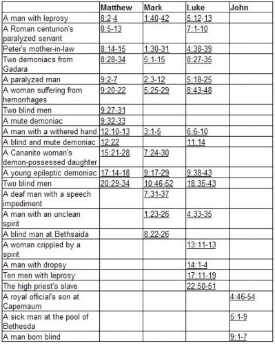 - Healing a paralytic: Matthew 9:1-8; Mark 2:1-12; Luke 5:18-26.