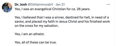 It is clear that when Josh Bowen decided that he could no longer reconcile his desire to live as a gay man, with the texts of the Bible, and specifically the words of Jesus, this contributed to his decision to become an atheist and deny the truths of the Bible. Josh said he was gay at his Twitter feed in 2022.[1]