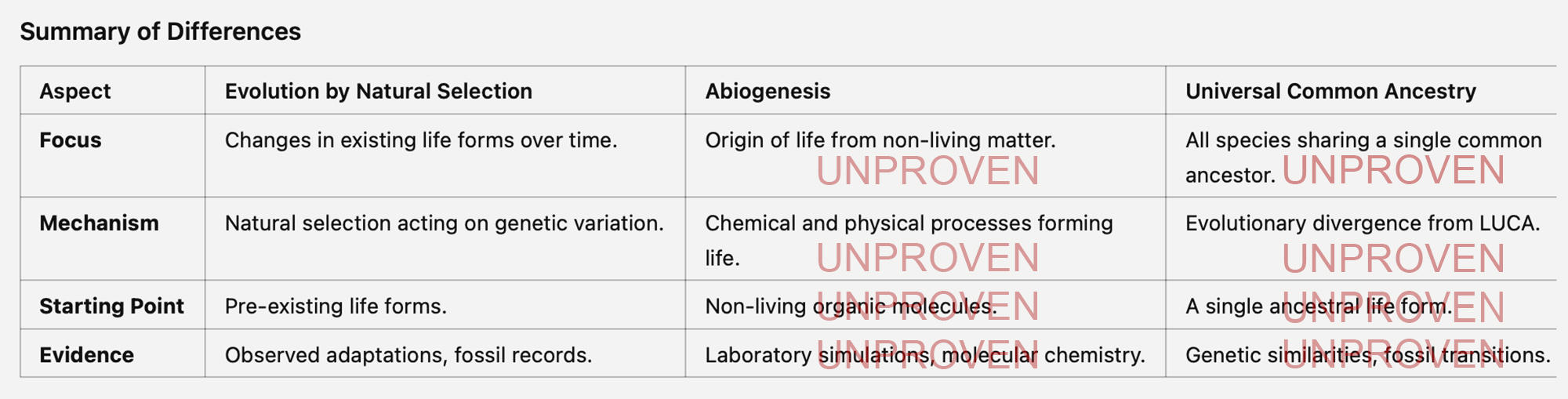 Key Point: Evolution by natural selection starts with existing life forms and focuses on how species change and adapt over time. It does not explain the origin of life itself.