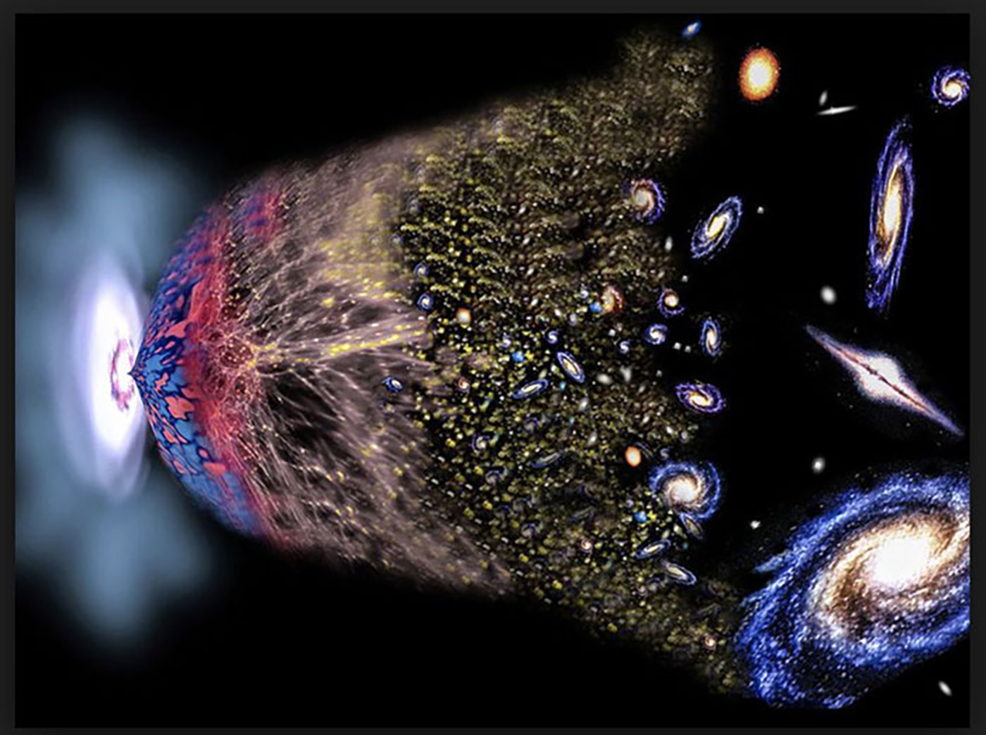 It was not until 1915, that Albert Einstein said the universe had a beginning and it was stretched out—expanding. The universe began as a tiny particle of densely compacted energy, and it exploded in one direction—like a curtain—like the graphic image.