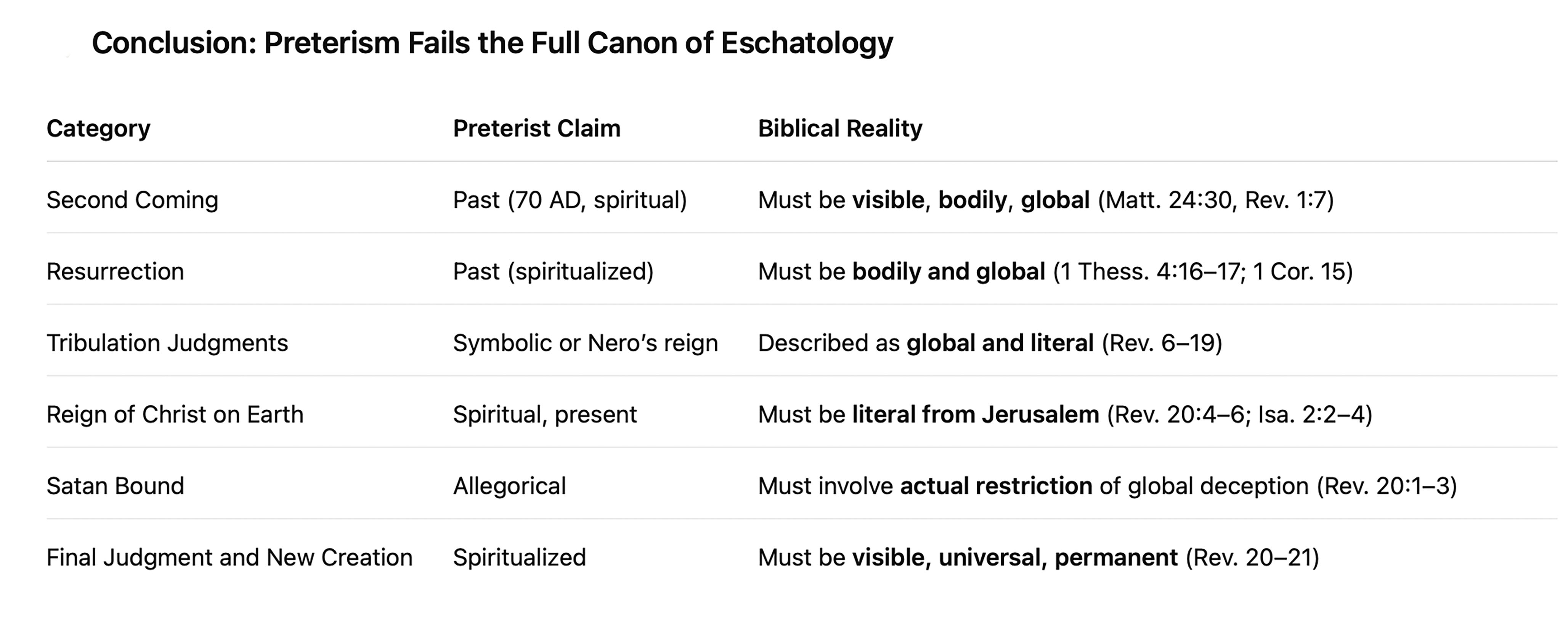 The Preterist position completely collapses under the weight of these descriptions, which have no historical parallel, no documentation from Roman or Jewish sources, and no theological or literary warrant to be spiritualized without dismantling the grammatical-historical hermeneutic.