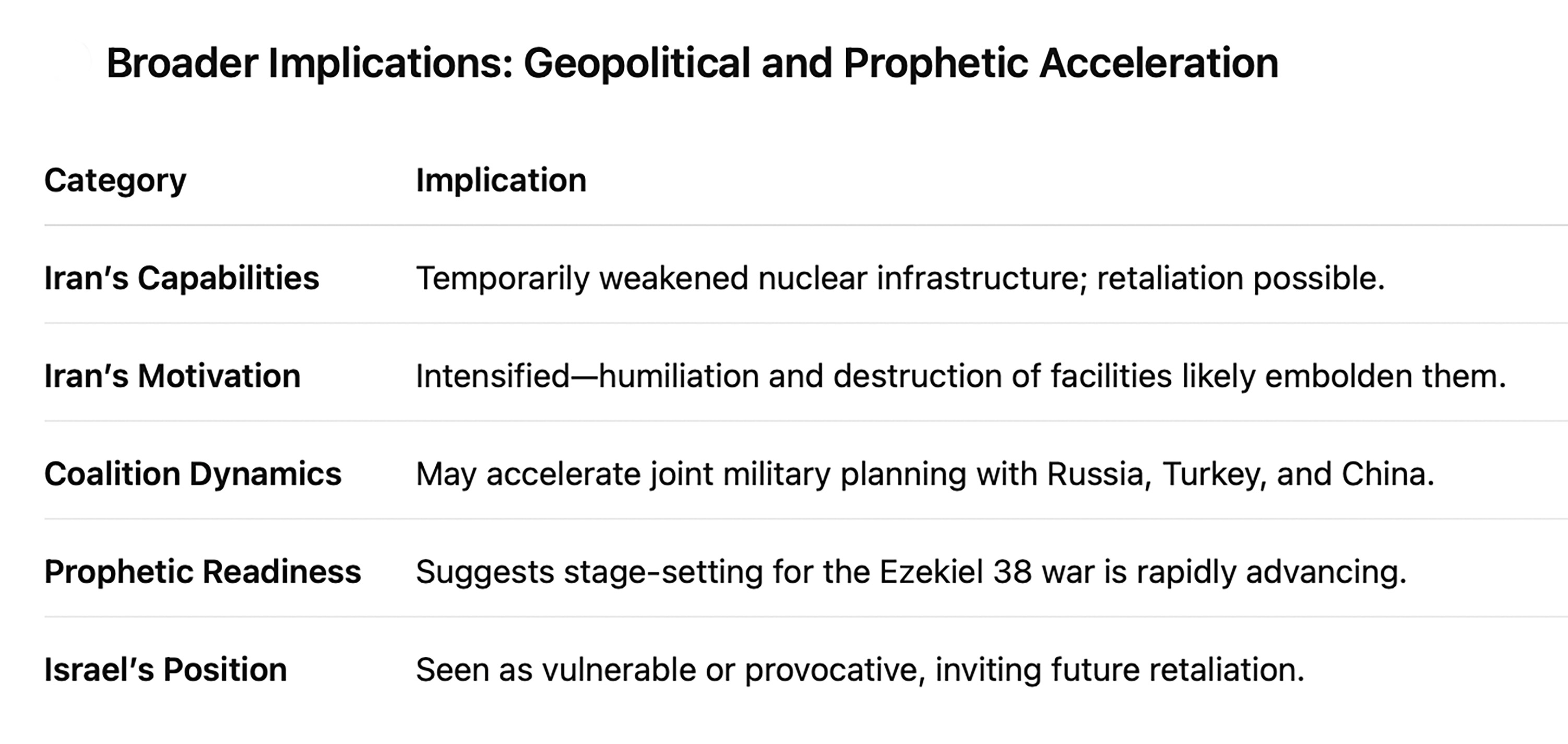 This bombing delays Iran’s military capabilities but does not derail its prophetic role in the Ezekiel 38 coalition. In fact, it may strengthen the resolve of Iran and its allies, moving the world closer to the precise conditions foretold by Ezekiel: