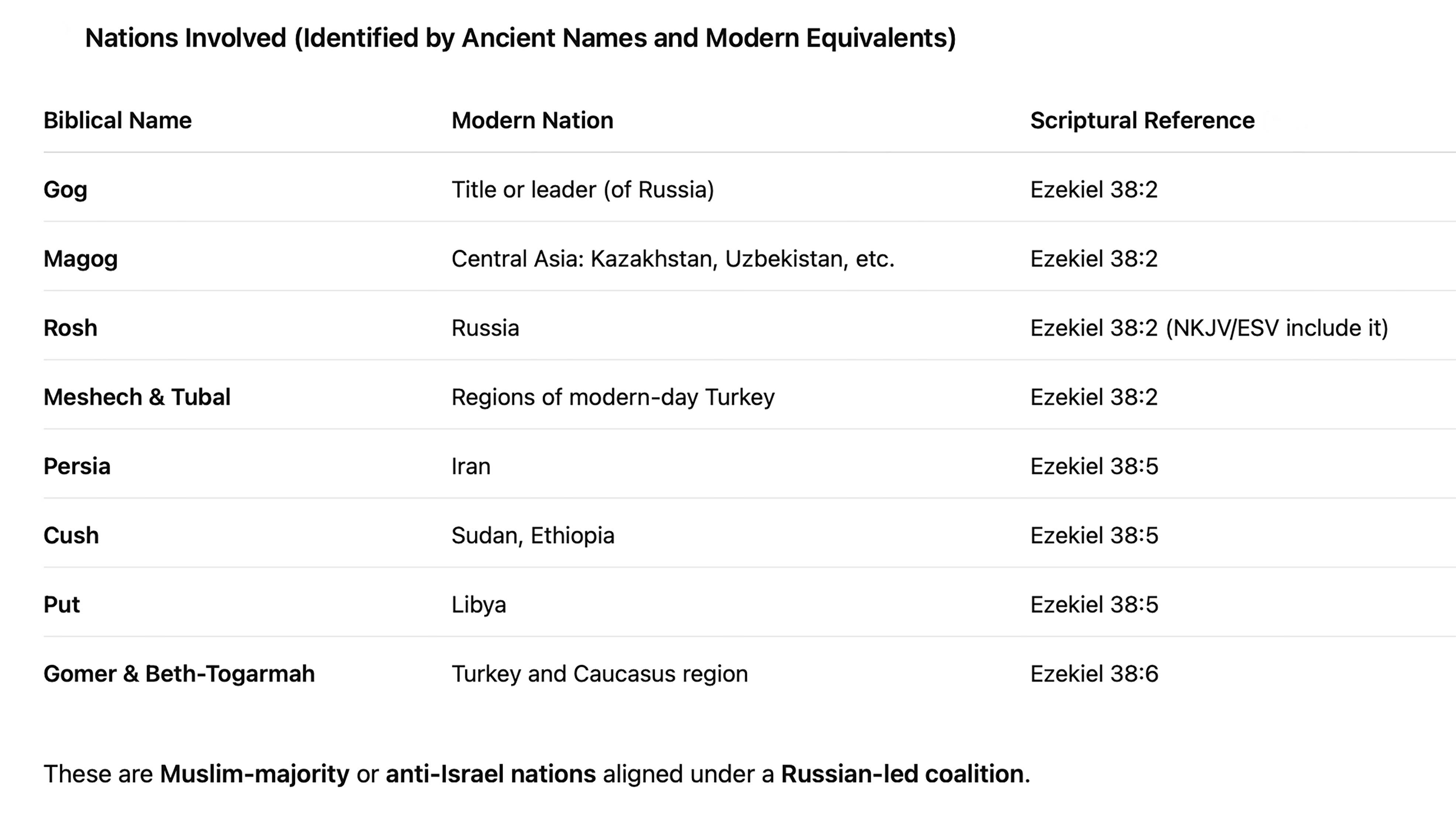 • Russia (Rosh, Gog, Meshech, Tubal)