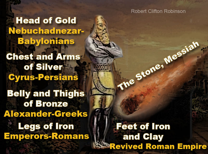 This great image that Nebuchadnezzar saw in his dream was an illustration of the four Gentile kingdoms of the world that would be present during the Times of the Gentiles. Head of Gold, Chest and Arms of Silver, Belly and Thighs of Bronze, Legs of Iron, Feet partly of Iron and Clay: