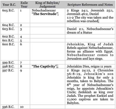 [7] Chart by Rob Robinson. The Servitude Begins: Dakes Commentary on the Book of Jeremiah, Chapter 52:1-10. The Captivity Begins: Kenneth Strand, “Thiele’s Biblical Chronology As a Corrective for Extrabiblical Dates,” Andrews University Seminary Studies 34 (1996) 310, 317. The city was taken and the rebellion was crushed: Dakes Commentary on the Book of Jeremiah, Chapter 52:4.