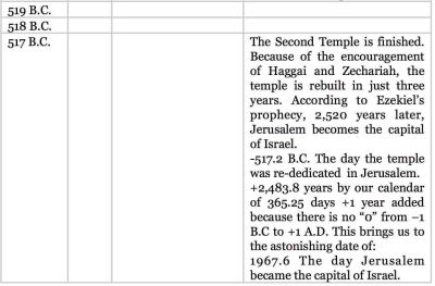 If we use 517 B.C, for the date when the temple was completed, then add 2,520 years* (2,483.8 years at 365.25 days per year), the time period required from Ezekiel 4 and Leviticus 26, we come to June 7, 1967, the day Jerusalem became the capital of Israel again for the first time in 2,000 years.